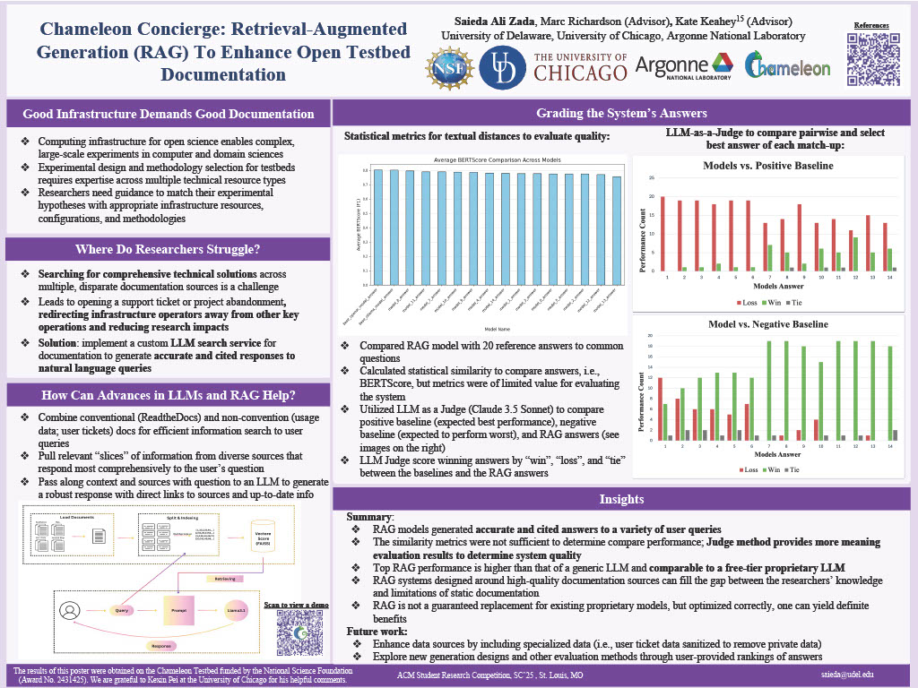Chameleon Concierge uses Retrieval-Augmented Generation to help researchers navigate complex open science testbed documentation. When designing experiments, researchers struggle to find technical solutions across multiple documentation sources, often leading to support tickets or project abandonment. Our custom LLM search service generates accurate, cited responses to natural language queries. Results show RAG models perform comparably to proprietary LLMs while bridging the gap between researcher knowledge and static documentation, improving research productivity and infrastructure operations.